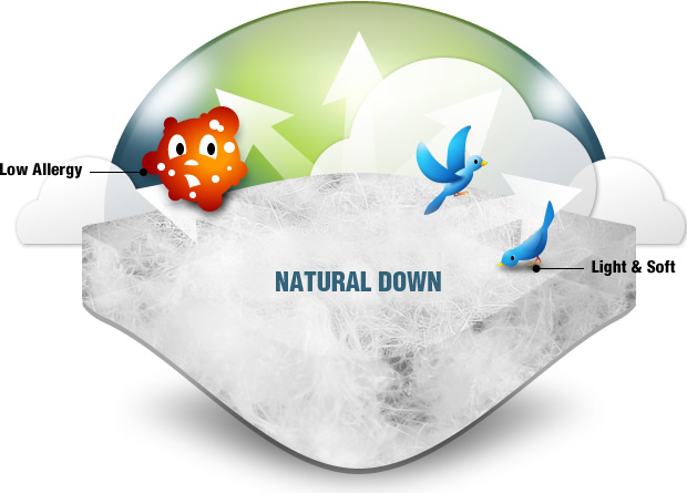 | Down is ECO friendly, soft and light. The thermal capacity of down surpasses all synthetic fabric products. According to the studies, there are few allergens on the surface of down and feather. |